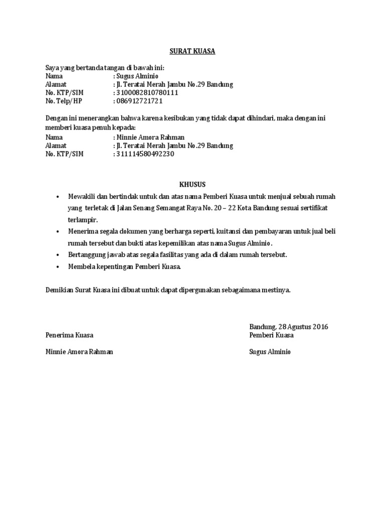 25 Contoh Surat Kuasa Resmi Baik Dan Benar Untuk Berbagai Situasi from learniseasy.com Ketika anda ingin menjual sebidang tanah, namun lokasinya berada jauh dari domisili saat ini. Surat kuasa merupakan sebuah surat yang berisi informasi dalam memberikan kewenangan untuk mewakili dalam melakukan suatu hal atau perbuatan atas nama dari pemberi kuasa. Proses penjualan tanah melalui kuasa terjadi biasanya dikarenakan adanya suatu alasan yang membuat sang pemilik tanah tidak bisa menjual tanahnya secara langsung kepada si pembeli sehingga kemudian. Berikut ini tips cintamobil.com mengenai contoh surat kuasa perpanjangan stnk mobil yang bisa dibuat jika berhalangan hadir untuk pengurusan perpanjangan stnk. Dan jika diperlukan anda bisa membawa juga sura kuasa untuk perpanjang stnk dari pemilik asli. Contoh surat kuasa pengambilan bkpb mobil di leasing. Surat kuasa khusus penjualan tanah. Biasanya mereka yang berada di jabatan tertentu seperti di sebuah perusahaan, instansi atau pemerintahan, tentu mereka sudah terbiasa membuat surat kuasa.